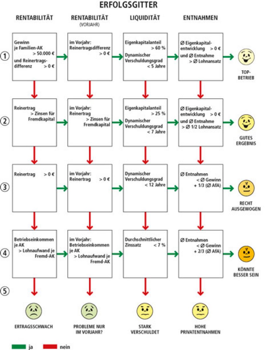 Von links oben anhand der Ja/Nein-Fragen durchgegangen, gibt es Aufschluss darüber, ob der Betrieb insgesamt eher gut oder schlecht dasteht. Für eine genauere Untersuchung einzelner Erfolgsaspekte wie Rentabilität oder Liquidität lassen sich die jeweiligen Spalten auch von oben nach unten abarbeiten.