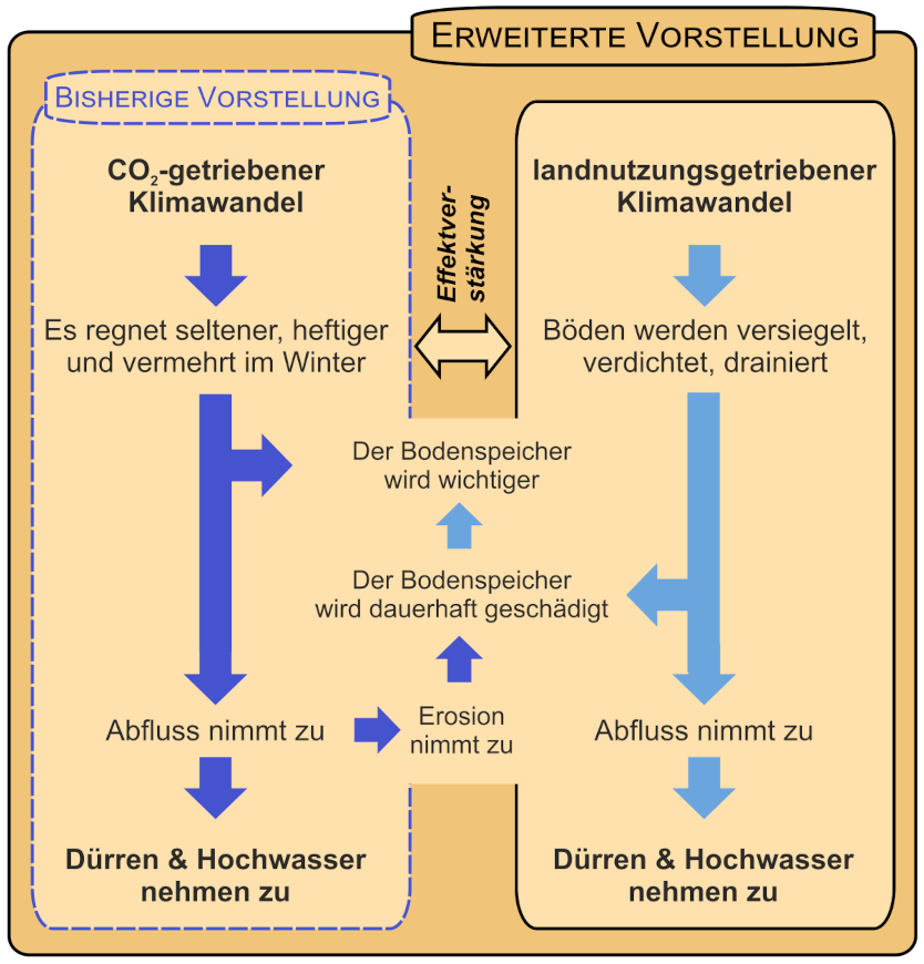 Die Böden spielen eine wichtige Rolle als Puffer für Niederschlagswasser: wie ein Schwamm lässt ein intakter Boden Wasser infiltrieren, speichert es über Monate und stellt es den Pflanzen auch in Trockenzeiten zur Verfügung. Ein verdichteter oder versiegelter „Schwamm“ funktioniert schon bei durchschnittlichen Niederschlägen nicht mehr richtig. Wenn durch den CO2-getriebenen Klimawandel die Wassermenge eines Regenereignisses zunimmt, ist das bei verdichtetem oder versiegeltem Boden deutlich fataler als bei einem intakten Boden. Somit verstärken sich der CO2-getriebene und der landnutzungsgetriebene Klimawandel in ihren Wirkungen.