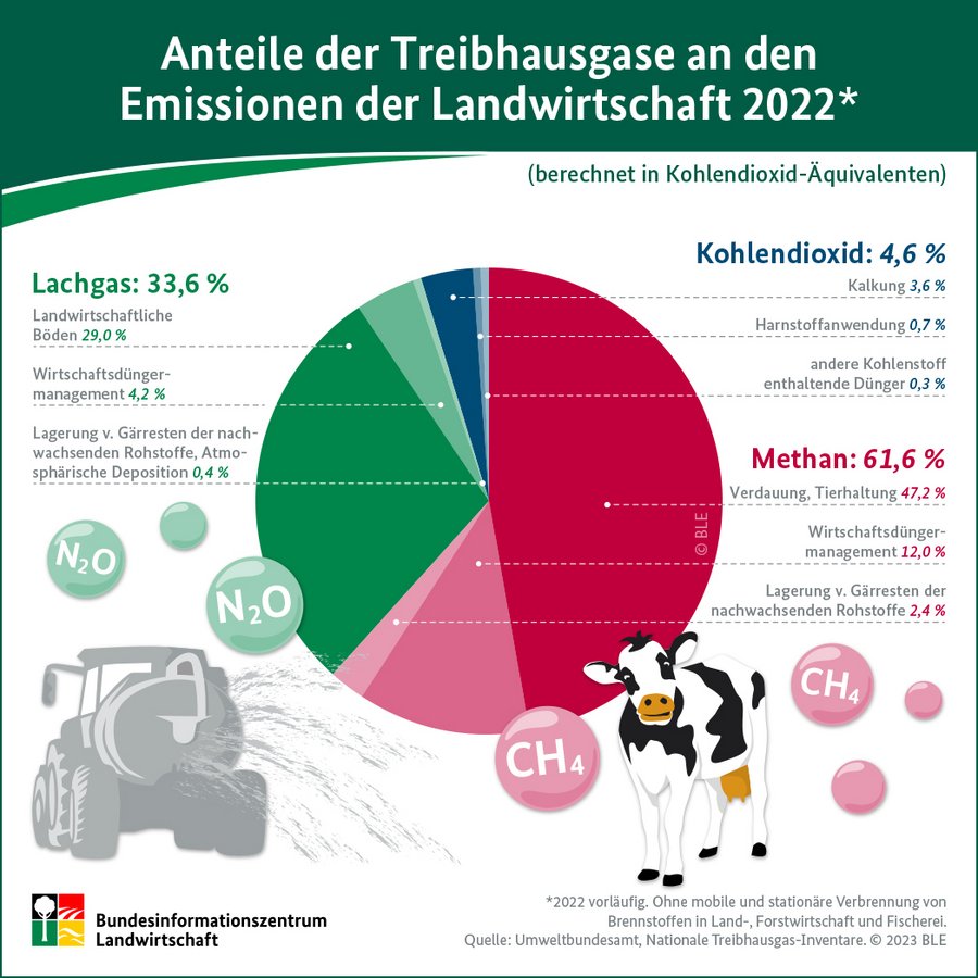 Die Landwirtschaft emittierte im Jahr 2022 55,5 Millionen Tonnen CO2-Äquivalente. Das anteilig wichtigste Treibhausgas ist dabei Methan.