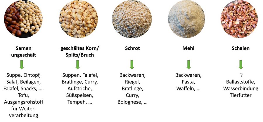 Der Weg der Hülsenfrüchte in die menschliche Ernährung ist sehr vielgestaltig. Traditionell können Hülsenfrüchte unverarbeitet bis gering verarbeitet direkt in der Herstellung nährstoffreicher Speisen und Backwaren verwendet werden. Der Markt bietet ungeschälte/geschälte Samen, Schrot oder auch Vollmehle an. Durch den geringen Verarbeitungsgrad enthalten die Hülsenfrüchte noch alle beziehungsweise die meisten wertgebenden Inhaltsstoffe. Auch das Angebot an wenig verarbeiteten Produkten auf Basis von Hülsenfrüchten wie Pasta, Tofu, Tempeh, Aufstrichen und Fertigmischungen für Bratlinge, Falafel und vieles mehr ist im Lebensmittelbereich reichhaltig.