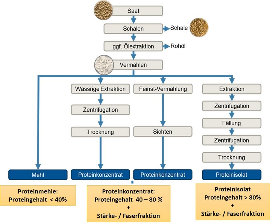 Für höher verarbeitete Lebensmittel wie zum Beispiel Fleisch-, Milch-, Ei- und Fischalternativen sind zwar ebenfalls die Saaten der Leguminosen der Ausgangsrohstoff, doch durch unterschiedliche, mehr oder weniger aufwändige, Technologieverfahren wird dafür das Protein aus den Hülsenfrüchten herausgelöst. Je nach Einsatz- und Anwendungsbereich werden proteinangereicherte Mehle, Proteinkonzentrate oder -isolate aus Leguminosen mit verschiedenen technofunktionellen und sensorischen Eigenschaften und Proteinkonzentrationen gewonnen. Sowohl die Proteinfraktionen als auch die parallel anfallenden Stärke- und Faserfraktionen fließen in mehrere Weiterverarbeitungslinien ein. Dabei können sie entweder der entsprechenden Rezeptur beigefügt oder weiter technisch aufbereitet werden.