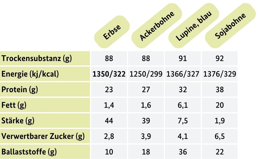 Zu den heimischen großkörnigen Hülsenfrüchten zählen Ackerbohne, Körnererbse, Blaue und Weiße Süßlupine und Sojabohne. Diese werden in Deutschland überwiegend für den Fütterungsbereich angebaut. Nur ca. 5 – 7,5 % der Ackerbohnen und Lupinen, gut 10 % der Sojabohnen und 25 % der Körnererbsen finden den Weg in die menschliche Ernährung (BZL 2024). Die als Nischenkulturen anzusehenden Linsen, Kichererbsen, Platterbsen sowie diverse Trockenbohnenarten wie Weiße, Schwarze, Borlotti-, Kidneybohnen werden in kleinem Umfang ausschließlich für den menschlichen Verzehr angebaut. Unverarbeitet bis gering verarbeitet bereichern sie den Speiseplan der Verbraucher.