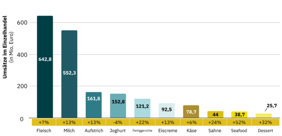 Der deutsche Markt für pflanzenbasierte Lebensmittel ist in der Zeitspanne von 2020 bis 2022 um 42 % gewachsen (GFI 2022). Aktuell nehmen in Deutschland besonders Milch- und Fleischalternativen den größten Marktanteil im Bereich alternativer Proteine ein.