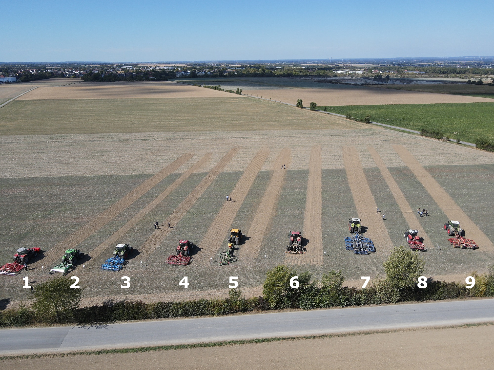 1 - Flachgrubber (Güttler, Super Maxx), 2 - Spezial-Flachgrubber (Lyckegard, KvikFinn), 3 - Universalgrubber (Lemken, Karat), 4 - Flachgrubber (Horsch, Finer), 5 - Kettenscheibenegge (Kelly), 6 - Breitscharhobel (Lagrot), 7 - Flachgrubber (Köckerling, Flatliner), 8 - Universalgrubber (Horsch, Terrano), 9 - Kurzscheibenegge (Väderstad, Carrier)