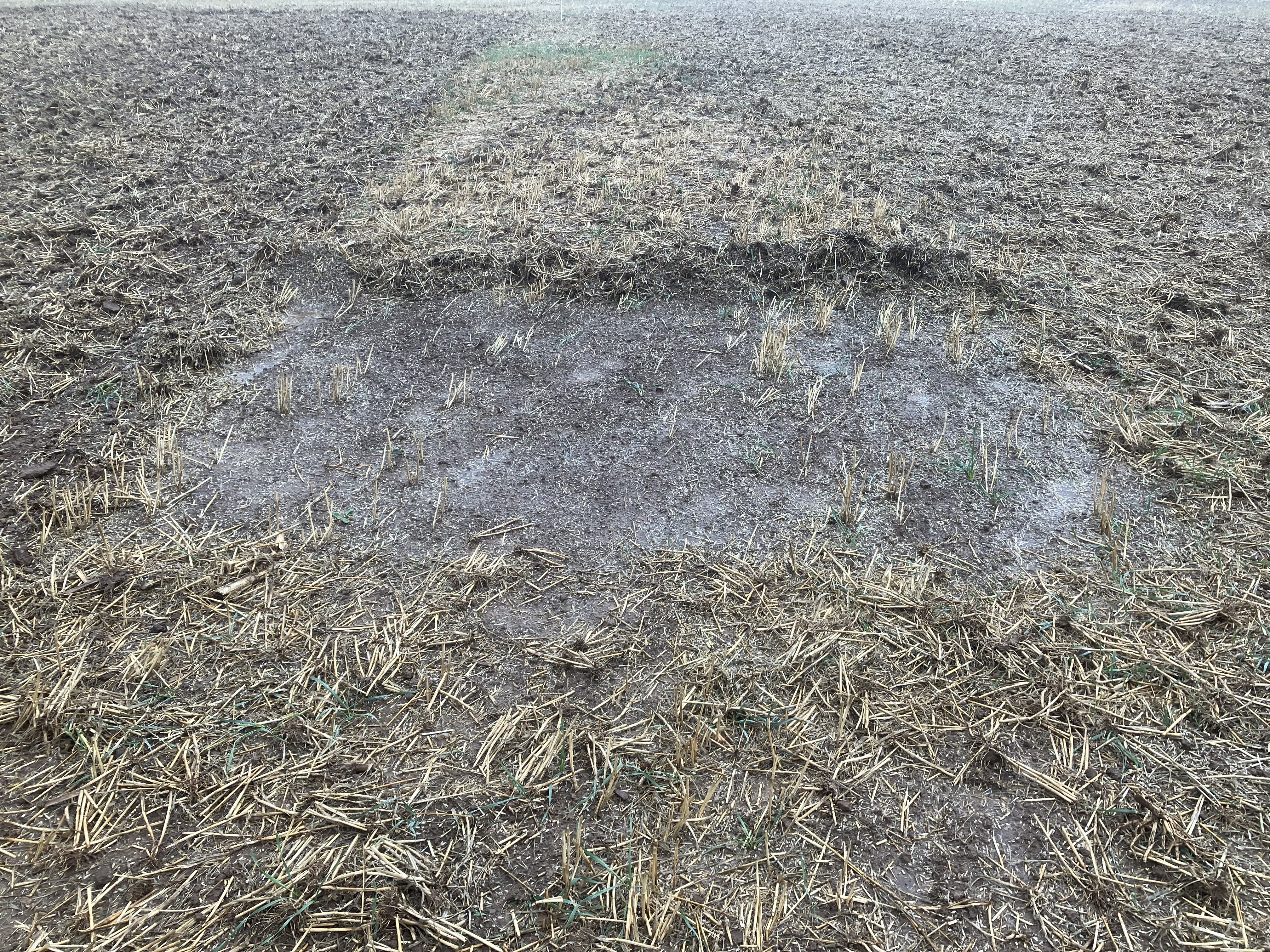 Auf einem flachgründigen Mergelstandort (um die 20 Prozent (Kalk-)Steine) in Geseke-Rüthen hat der Pflanzenschutzdienst der LWK NRW zusammen mit örtlichen Landwirten des Arbeitskreises Hellweg/Soester Börde einen Versuch zur flachen Bodenbearbeitung angelegt. Auch hier wurde ein breites Spektrum verschiedener Geräte, darunter Flachgrubber, Grubber, Scheibenegge, Pflug und Strom ausgewählt. Das Versuchsjahr war von intensiven Frühjahrsniederschlägen geprägt, sodass der erste Einsatz der Bearbeitungsgeräte nach mehrmaliger Verschiebung des Termins erst Anfang Mai stattfinden konnte. Bekämpft wurden kniehohe Ausfalltriticale, größere Storchenschnabel, Vergissmeinnicht, Ackerstiefmütterchen sowie ährentragender Ackerfuchsschwanz.