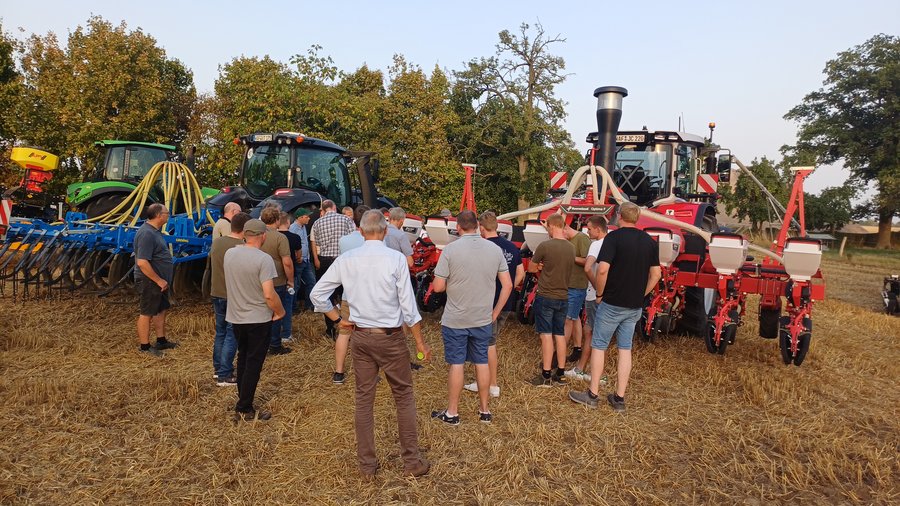 15.08.2025, Angela Sievernich (LWK NRW) Am 13. August 2025 war die Raps- und Getreideernte für die meisten Betriebe im Raum Ennigerloh bereits abgeschlossen, die Aussaat für das nächste Jahr hatte noch nicht begonnen. Rund 70 Besucher nutzten daher die Gelegenheit, um auf dem Demonstrationsbetrieb Schlüter in Ennigerloh einen aktuellen Blick auf die Maßnahmenflächen des Projekts zu werfen und über den Tellerrand zu blicken. Im Rahmen des Feldabends wurden eine Zwischenfruchtfläche, die direkt nach der Wintergerstenernte ausgesät worden war, sowie eine Maisfläche, auf der der Mais im PUDAMA-Verfahren gelegt worden war, besichtigt. Außerdem waren die eingesetzten Maschinen auf dem Hof ausgestellt und wurden von den Herstellern bzw. Landwirten vorgestellt. Wie gut die Aussaat der Zwischenfrüchte mit dem Cover Seeder der Firma Müthing funktioniert, und wie sich das Verfahren im Vergleich zu anderen Techniken der ZWischenfrucht-Aussaat schlägt, lesen Sie im Artikel.