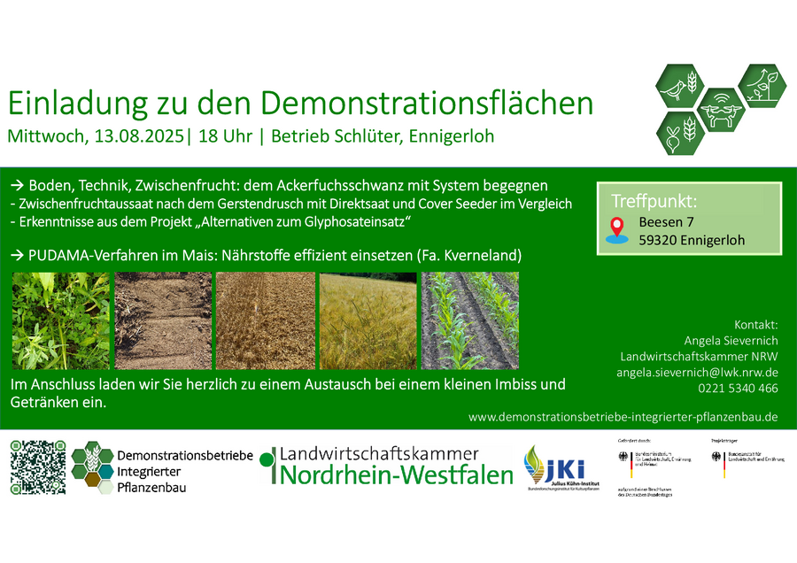 Am Mittwoch, den 13. August 2025, lädt der Betrieb Schlüter in Ennigerloh, NRW, auf seine Demonstrationsflächen ein. Im Fokus der Feldbegehung: systemare Ansätze zur Ackerfuchsschwanzkontrolle, zum Beispiel durch die zeitnahe Etablierung von Zwischenfrüchten nach dem Gerstendrusch. Der Betrieb hat dafür neben der klassischen Direktsaat unter anderem den Cover Seeder von Müthing eingesetzt. Wie sich die Maschine im Vergleich zu anderen Verfahren schlägt, kann vor Ort besichtigt werden. Außerdem wird das PUDAMA-Verfahren im Maisanbau gezeigt, bei dem die Firma Kverneland durch die systematische Ablage von Düngedepots unter jedes Maiskorn Düngemitteleinsparungen-Einsparungen von bis zu 25 % verspricht.