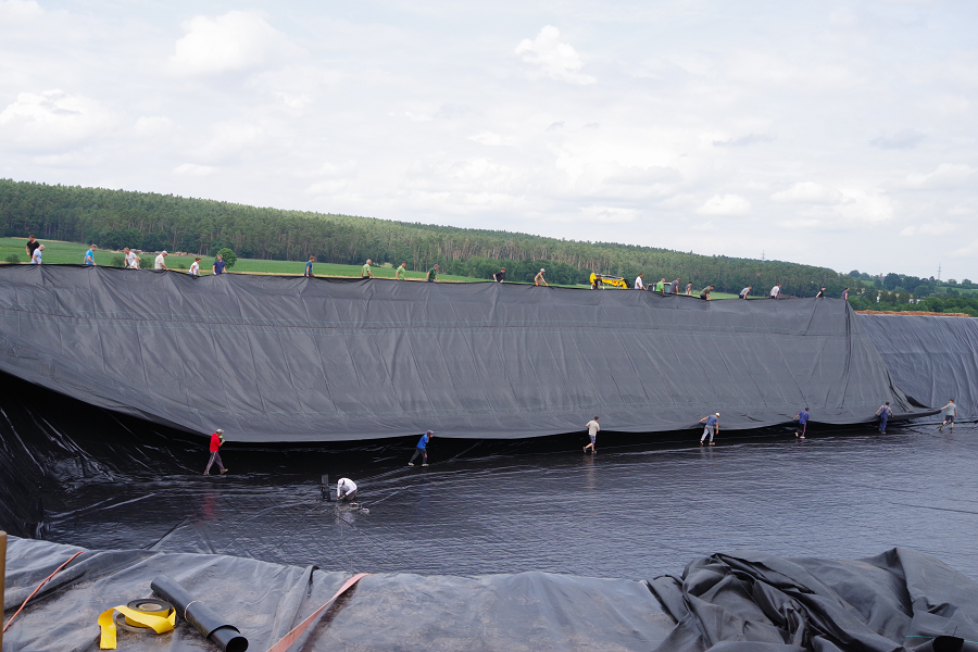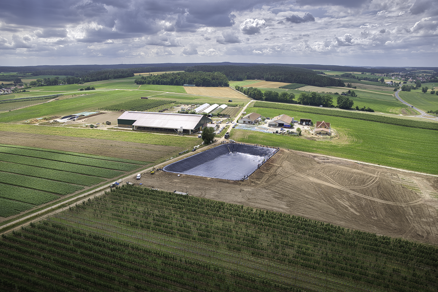 Die Folie für das Speicherbecken wurde in einem Stück gefertigt und von einem niederländischen Hersteller geliefert. Sie passte exakt in das Becken mit einer Fläche von 4.000 Quadratmetern und wog rund drei Tonnen. Der Standort des Beckens liegt auf einem höher gelegenen Areal des Obsthofs.
