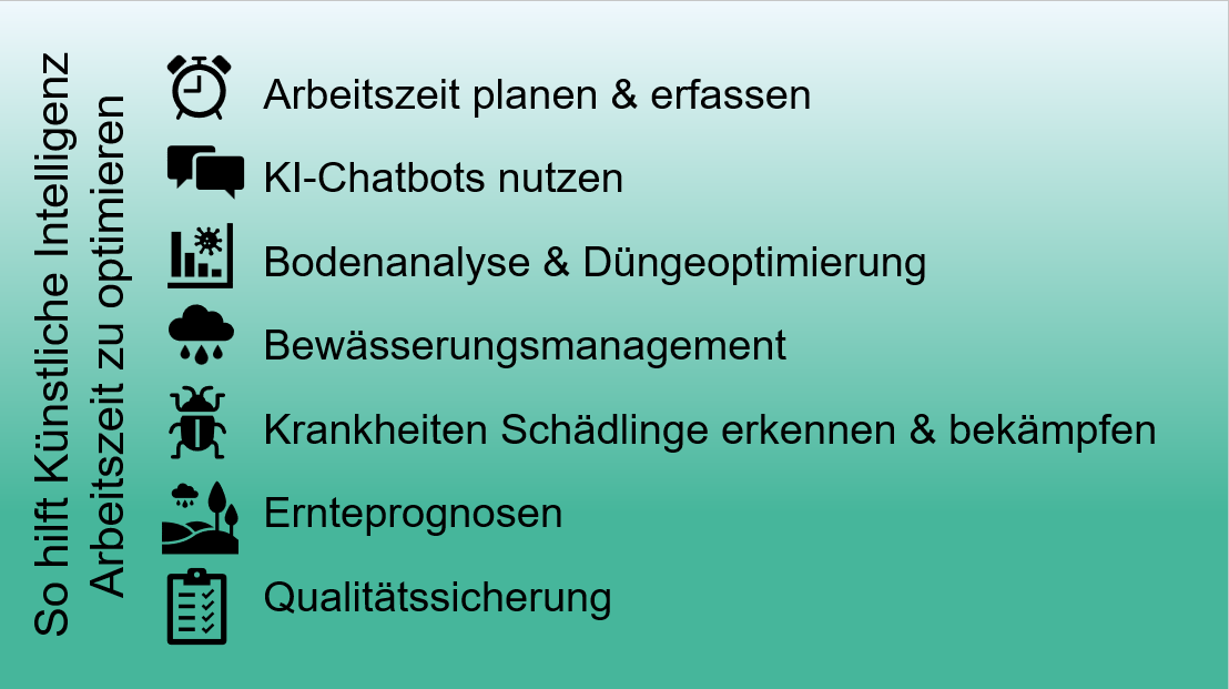 Daneben werden KI-Tools bereits bei Planung, Anbau, Pflanzenpflege und Ernte in verschiedensten Maschinen im Gartenbau sowie der Landwirtschaft verwendet – manchmal sogar ohne, dass dies dem anwendenden Betrieb richtig bewusst ist. Weiteres Potenzial liegt etwa in Anwendungsfeldern wie dem ressourcenschonenden Bewässerungsmanagement, der Erfassung und Behandlung von Krankheiten und Schädlingen, Erntevorhersagen und im Bereich der Qualitätssicherung.