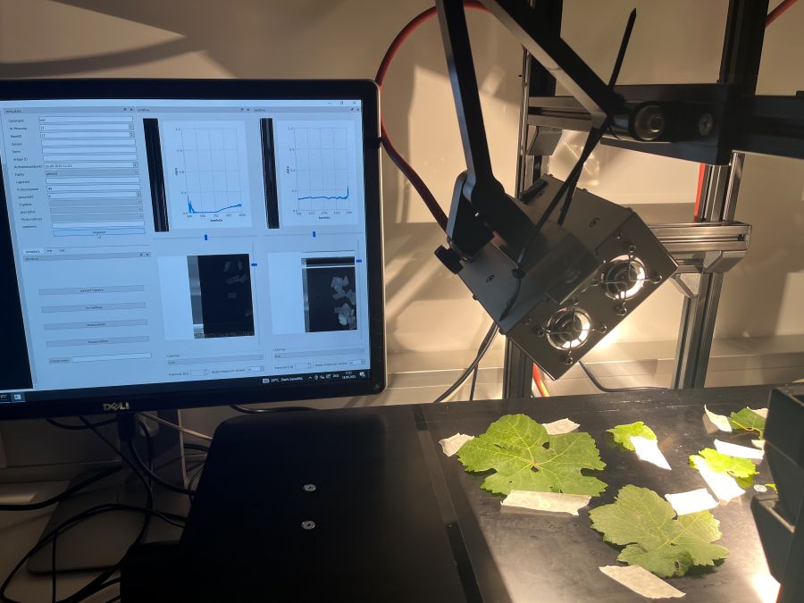2. Vorselektion im hyperspektralen Labor: In den Verdachtsregionen genommene Pflanzenproben werden vor Ort spektral analysiert und auf Schaderreger vorselektiert.