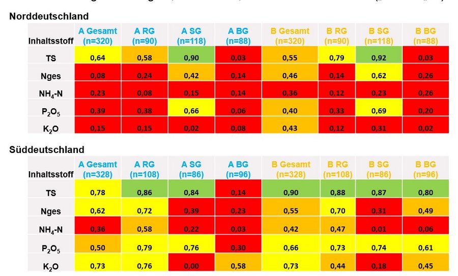 Über die deutlich bessere Übereinstimmung zwischen NIRS- und Labor-Werte für Süddeutschland lässt sich nur spekulieren. So könnten die für die Kalibrierung der NIRS-Sensoren verwendeten Gülleproben vermehrt von süddeutschen Betrieben stammen.