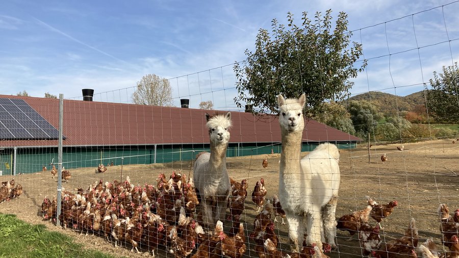 Die 7.500 Legehennen von Thomas Rose haben ganzjährig Auslauf ins Freiland. Dort werden auch drei Alpakas gehalten, um die Herde vor Wildtieren zu schützen. Die neugierigen Tiere halten Ausschau nach Feinden und können sie bei Bedarf vertreiben.