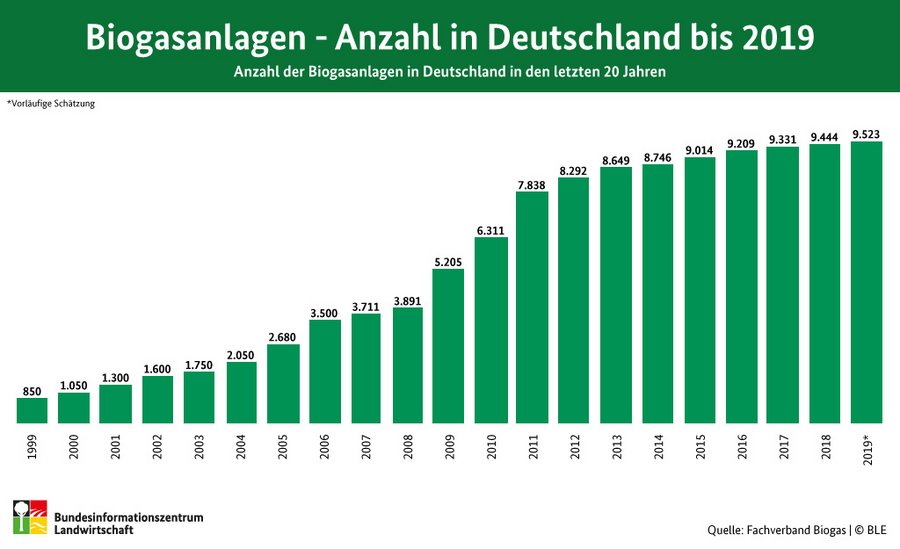 Aktuell gibt es in Deutschland etwa 11-mal so viele Biogasanlagen wie noch vor 20 Jahren.