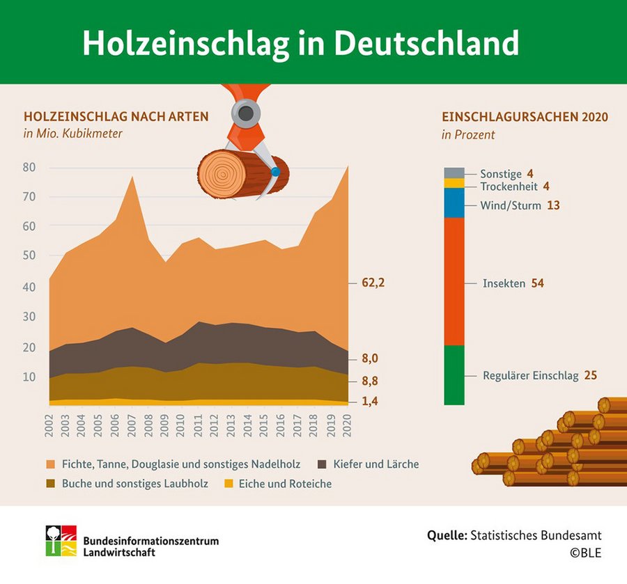 Der hohe Holzeinschlag im Jahr 2020 ist eine Folge vermehrter Waldschäden durch von Trockenheit und Hitze begünstigten Insektenbefall. Rund 54 Prozent (43,3 Millionen Kubikmeter) des Holzeinschlags 2020 wurde aufgrund von Insektenschäden vorgenommen. Der Anteil des Schadholzeinschlags insgesamt am Gesamtholzeinschlag lag 2020 bei rund 75 Prozent (60,1 Millionen Kubikmeter). Sowohl die Menge des Schadholzeinschlags als auch sein Anteil am Gesamtholzeinschlag waren noch nie so hoch wie im Jahr 2020. Neben Insektenbefall waren Schäden aufgrund von Wind beziehungsweise Sturm Ursache für 13 Prozent (10,2 Millionen Kubikmeter), Trockenheit für 4 Prozent (3,1 Millionen Kubikmeter) und sonstige Schäden für 4 Prozent (3,5 Millionen Kubikmeter) des Schadholzeinschlags.
