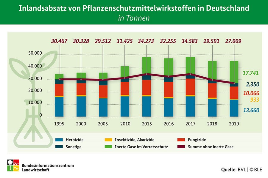 Der Absatz von Pflanzenschutzmittel schwankt vor allem witterungs- und preisbedingt. 2019 lag der Absatz von Pflanzenschutzmittelwirkstoffen (exklusive inerter Gase) mit rund 27 Tausend Tonnen deutlich unter dem Durchschnitt der letzten 25 Jahre von 31,4 Tausend Tonnen.
