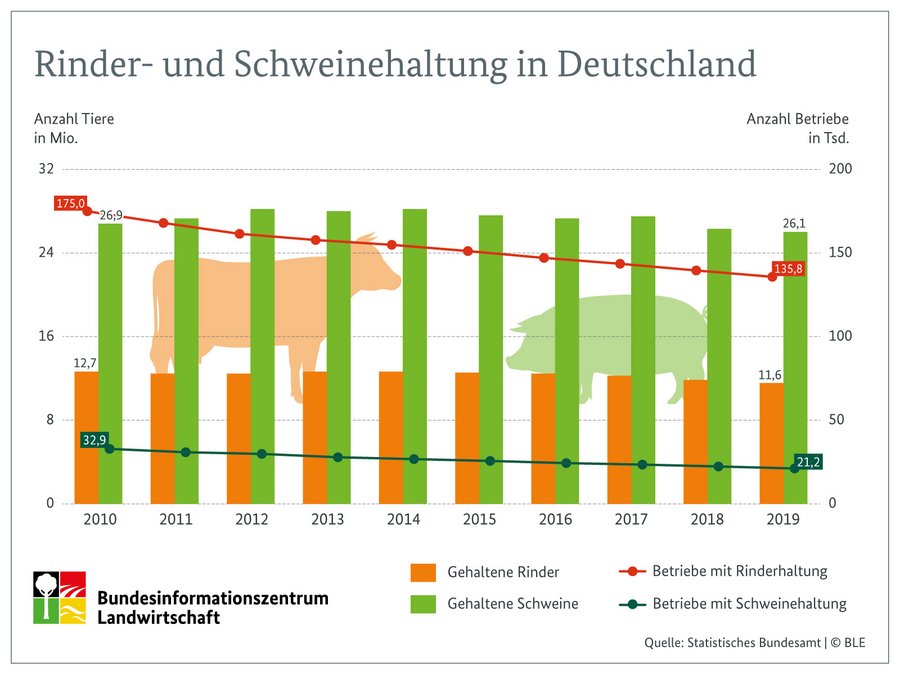 Sowohl bei Rindern als auch bei Schweinen nahm die Zahl der Betriebe stärker ab als die der gehaltenen Tiere. Damit steigt die Anzahl der durchschnittlich pro Betrieb gehaltenen Tiere: Bei Rindern steigt die Zahl der durchschnittlich gehaltenen Tiere von 73 auf 86, bei Schweinen von 818 auf 1.229 Tiere.