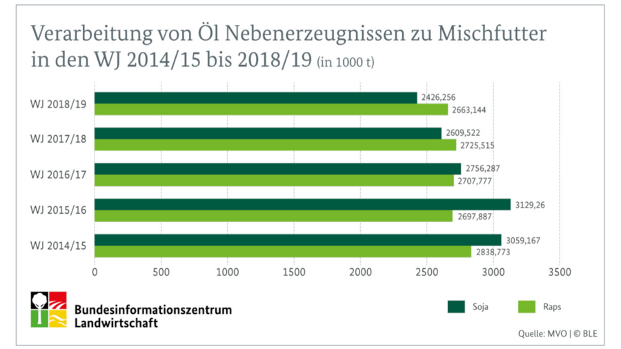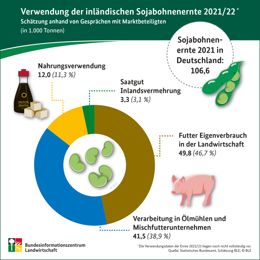 Nach Schätzungen des Bundesinformationszentrums Landwirtschaft (BZL) wurde der größte Teil der im Wirtschaftsjahr 2021/22 angebauten Sojabohnen für Futterzwecke verwendet: 47 Prozent der Sojabohnenernte wurde von den Landwirtinnen und Landwirten direkt verfüttert (Eigenverbrauch im Betrieb), 39 Prozent wurde industriell verarbeitet. Daraus entstehen Speise- und Futteröle sowie Sojaschrot als qualitativ hochwertiges Eiweißfuttermittel.