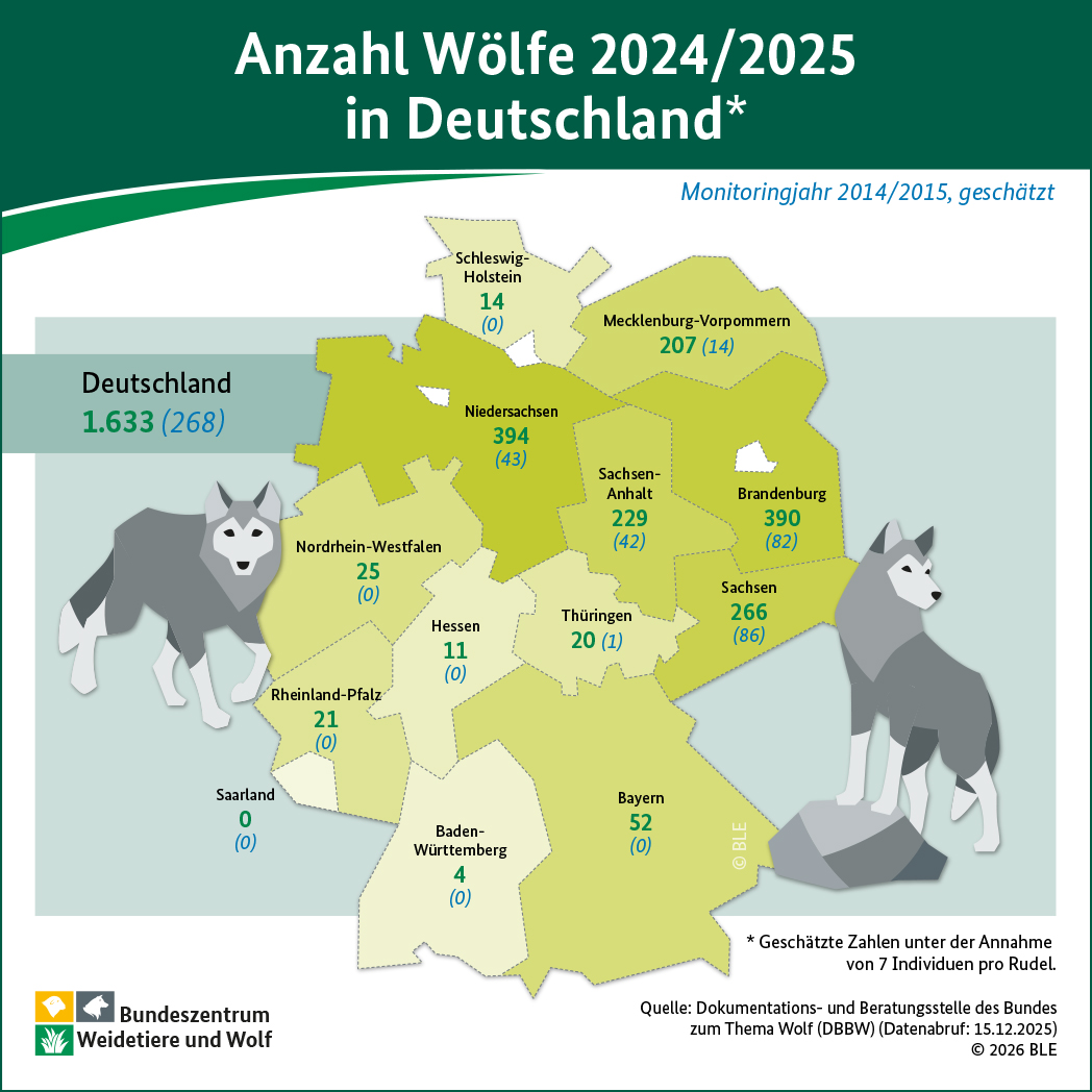 Spitzenreiter sind die Flächenländer Brandenburg und Niedersachsen mit je knapp 400 Wölfen. In den östlichen Bundesländern Mecklenburg-Vorpommern, Sachsen und Sachsen-Anhalt haben sich jeweils über 200 Wolfsindividuen angesiedelt.
