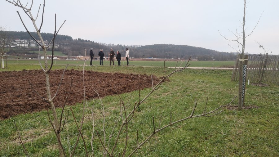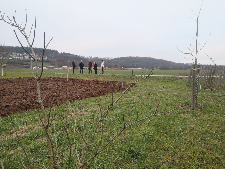 Bei der Besichtigung der Agroforstanlage erhielten die Teilnehmenden einen Einblick in die Kombination von Bäumen und landwirtschaftlichen Kulturen auf einer Fläche. Vor Ort wurde erläutert, wie dieses System Biodiversität fördert, positiv auf das Mikroklima wirkt, den Boden vor Erosion schützt sowie Schatten und Windschutz spendet.
